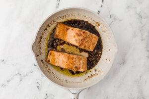 - Pour the reserved marinade into the pan and bring it to a gentle simmer. Let it bubble for 1 minute, then flip the salmon. Continue cooking for 3–4 minutes, spooning the sauce over the top as it reduces and turns glossy. If the sauce thickens too quickly or starts to look sticky, add a small splash of water to loosen it.
